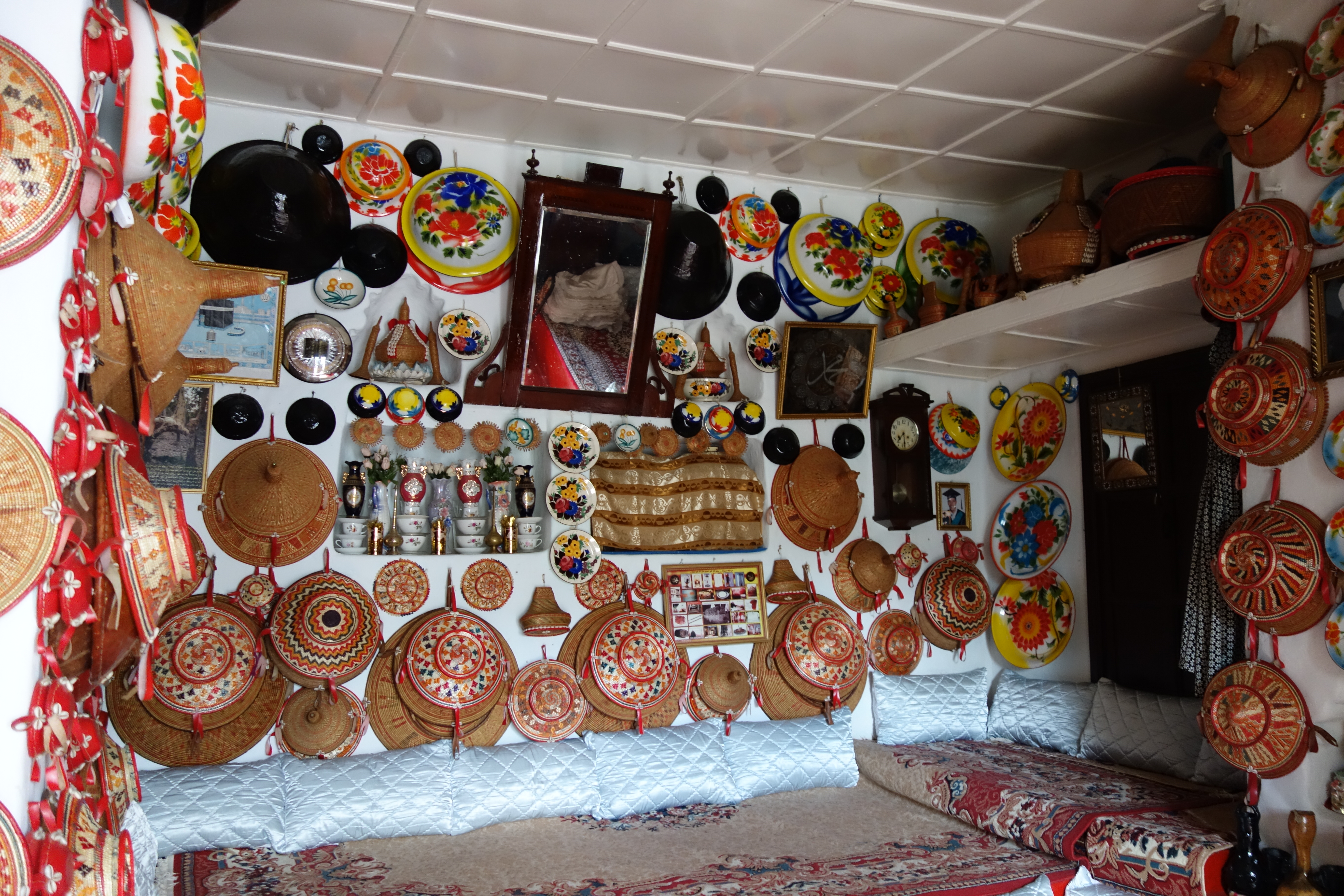 My guesthouse's lunge room was decorated in the traditional Harari style. Lounge rooms in many homes in the jugol share this layout and style. The different elevations of the seats denote seniority within the Harari social hierarchy. The highest seat, towards the back, is reserved for male religious leaders and scholars. The lowest seats are reserved for women.